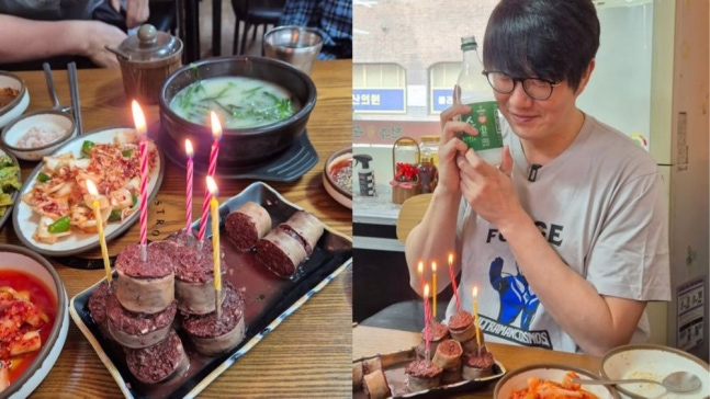 공개된 사진 속 성시경은 17일 자신의 생일을 기념해 순대국밥 식당에서 소소한 파티를 즐기는 모습이 담겼다. 그가 피순대에 초를 꽂아 만든 '피순대 케이크'는 소탈하면서도 유쾌한 성시경의 센스를 엿볼 수 있는 장면으로 눈길을 끌었다. 팬들은 "순대 케이크 좋네요", "기발한 케이크다", "국밥부장관 답네요", "생일 축하합니다"라는 댓글을 남기며 그의 유머와 센스에 반응했다.