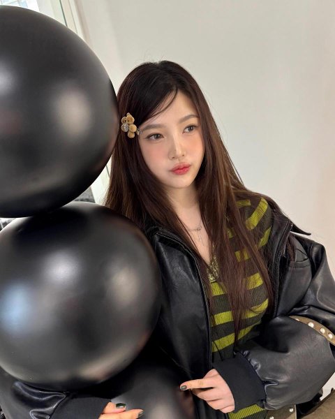 사진 속 조이는 부드러운 자연광이 스며든 실내에서 포즈를 취하고 있다. 이마 한쪽에는 귀여운 곰돌이 모양 머리핀을 착용해 큐트한 포인트를 주었고, 긴 생머리와 잔잔한 메이크업으로 특유의 자연스러움을 강조했다. 도톰한 블랙 가죽 재킷과 초록빛이 감도는 스트라이프 니트는 쾌청하면서도 다소 쌀쌀할 수 있는 4월 봄날씨에 잘 어울리는 아이템으로 눈길을 모았다. 전체적으로 차분하고 신비로운 무드와 함께, 검정색 대형 풍선을 들고 있는 듯한 포즈로 개성을 드러냈다. 조이는 가볍게 입술을 다문 채 부드러운 표정으로 카메라를 응시해, 고요하면서도 깊이 있는 감정을 전했다.