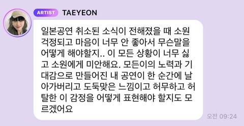 저번에도 비슷한 일 있지 않았나…? 태연 항상 엄청 열심히하고 공연하고 싶어하는데 뭐 때문인지 몰라도 펑크 자꾸나서 개빡칠듯
