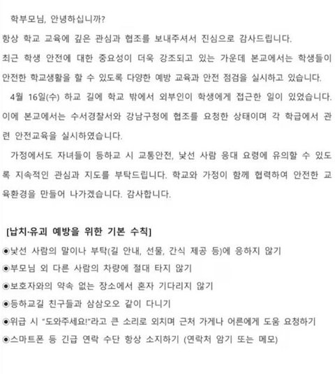 한편, 서울 강남권 초등학교들에서 잇달아 등하굣길 학생을 납치하려 했다는 소문이 빠르게 확산하고 있다. 이에 경찰은 사실관계 파악에 나섰고, 학교에서도 가정통신문 등을 통해 범죄 예방에 나서고 있다.