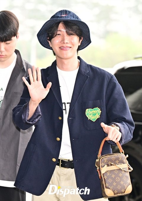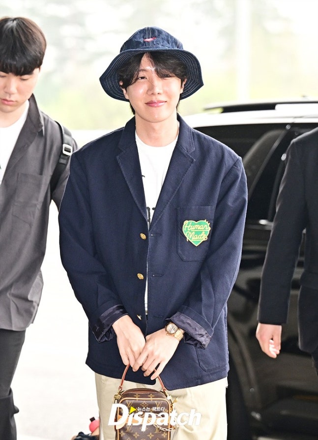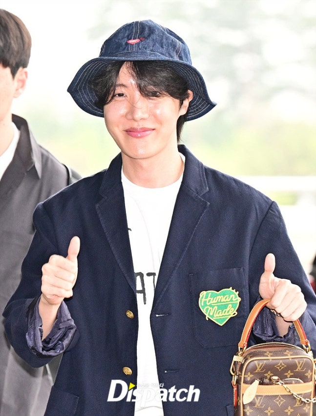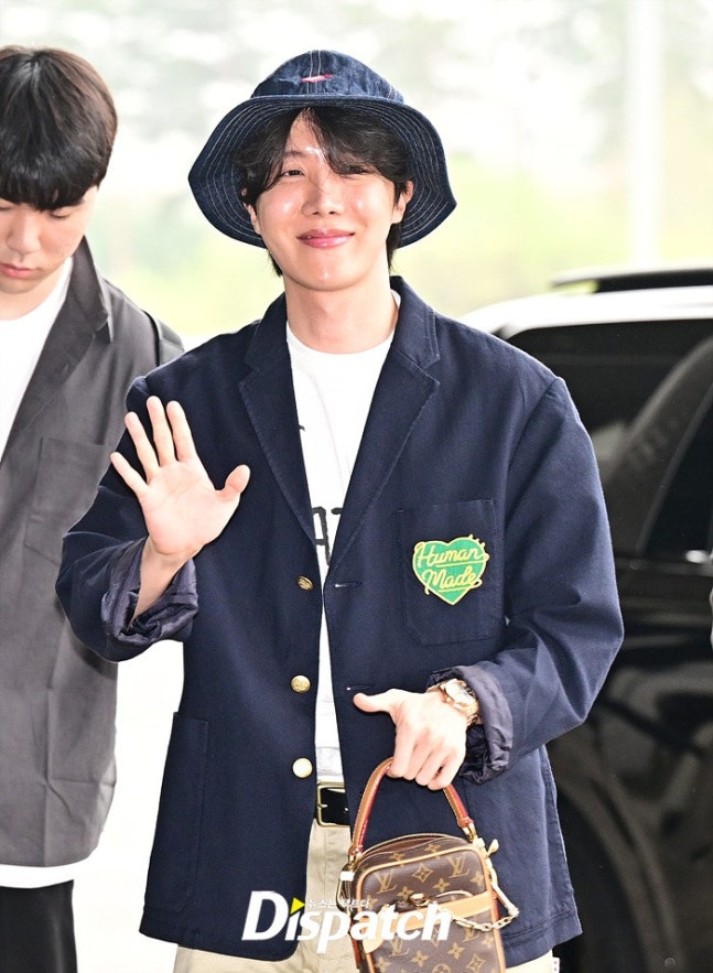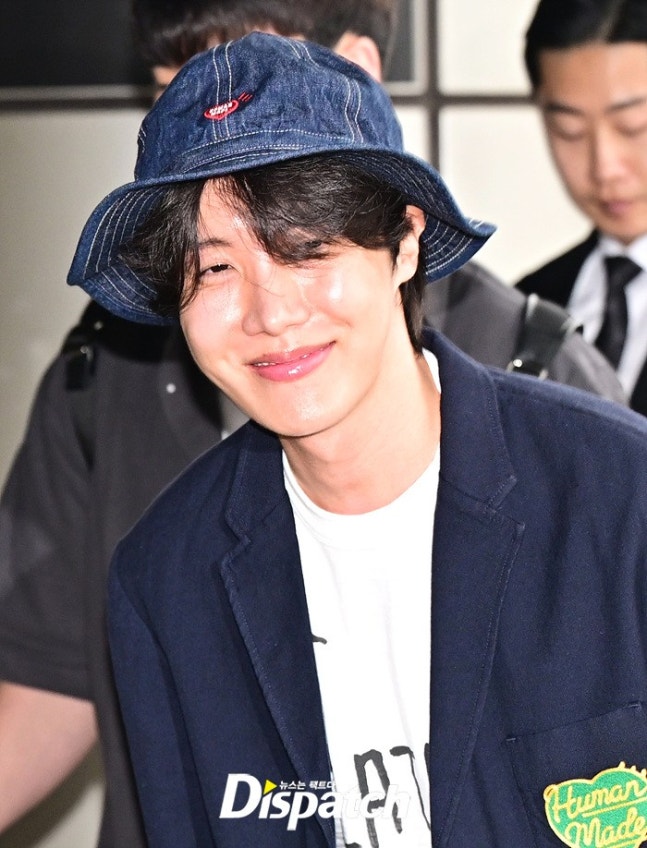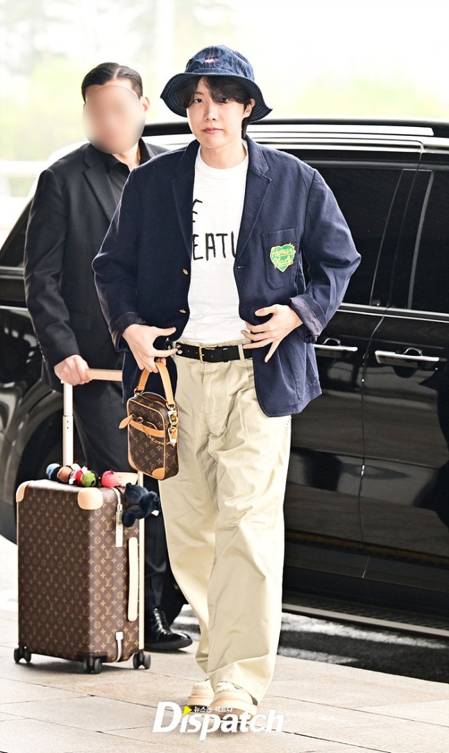 제이홉은 네이비 컬러의 재킷과 버킷햇, 와이드 팬츠로 남다른 패션감각을 뽐냈다. 공항에 모인 팬들을 위해 환한 미소로 출국장을 나섰다.