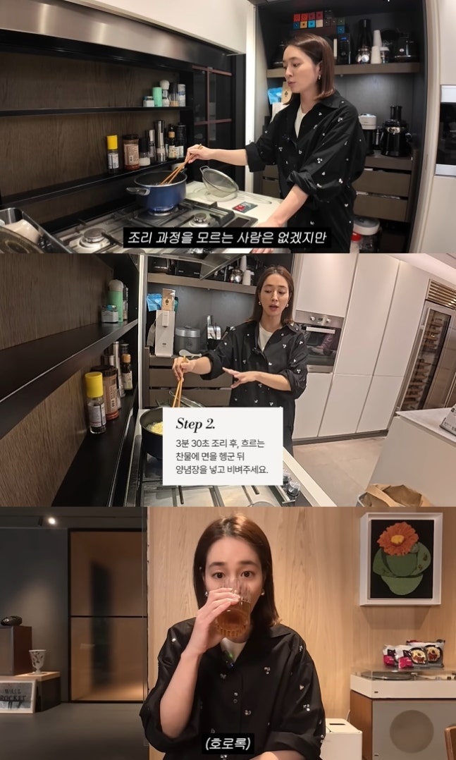 이민정은 “우리나라 비빔면 조리 과정을 모르는 사람이 없겠지만”이라며 비빔면 조리 순서를 설명했다. 이 과정에서 이민정의 주변에는 큰 와인 냉장고, 오븐을 비롯해 화이트, 메탈이 조화를 이룬 부엌이 시선을 끌었다.