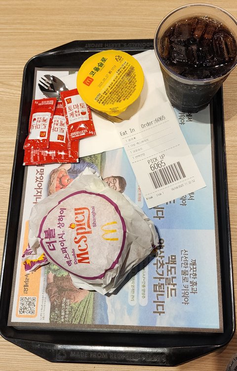 (사진2 설명) 저는 오늘(2025.04.18(금)) 미국 트럼프 대통령께서도 좋아하시는 맥도날드 메뉴 중 '더블 맥스파이시 상하이'버거를 점심식사했습니다. '더블 맥스파이시 상하이'버거 + '코울슬로' + 코카콜라 <-- Good! <촬영정보: 셔터속도 1/120s, 초점거리 23mm, 조리개 f1.8, 촬영감도 ISO 200, 삼성 Galaxy S22 Ultra 렌즈 사용, 촬영일자 2025.04.18(금) 오전 11:41, 최대우 촬영, 주소: 서울시 광진구 아차산로 376(자양동)>