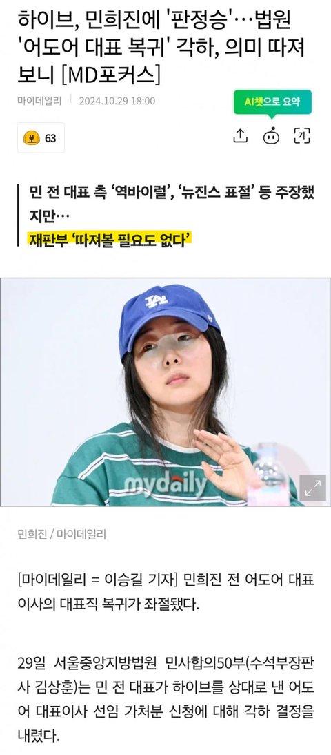 진짜 조금이라도 다퉈볼 여지가 있으면 부분적으로 일부 기각 같은 게 나왔어야 되는데그냥 뉴진스, 민희진의 주장이 애초에 법원 입장에선 황당한 소리고 들어줄 가치가 없다고 판정한 거