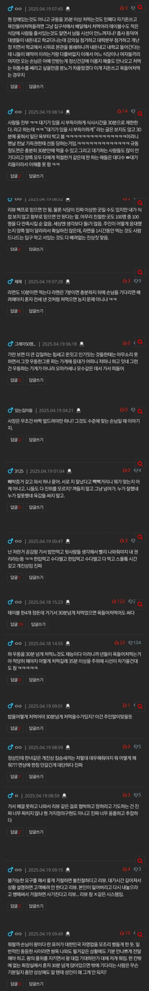 사장 댓글 보면 직접 얘기한게 아니라 안내문으로 적혀있다 하는데 밥먹으러가서 안내문 꼼꼼히들 읽으시나요? 식사시간 제한은 도착한 사람들이 바로 볼수있도록 입구에 대문짝만하게 써놔야 한다고 생각해요 오래먹는사람들이 알아서 발길을 돌릴수 있게끔