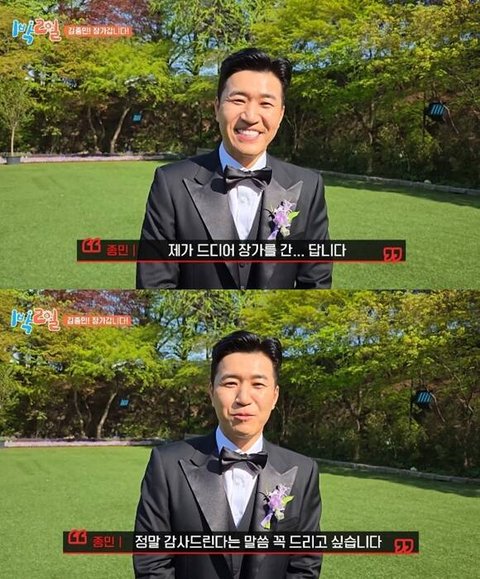 김종민은 지난 20일 오후 6시 서울 신라호텔 영빈관에서 11살 연하 비연예인 여성과 결혼식을 올렸다. 그는 이날 방송된 KBS2 예능프로그램 '1박 2일 시즌4'(이하 '1박 2일')를 통해 "제가 드디어 장가를 간다. 여러분들이 너무 축하를 많이 해주셔서 감사하다는 말씀을 꼭 드리고 싶다"며 "장가가서 잘 살겠다"고 소감을 전했다.