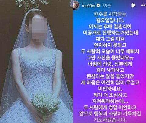 그는 "한 주를 시작하는 월요일이다. 아끼는 후배 결혼식이 비공개로 진행하는 거였는데 제가 그걸 미처 인지하지 못하고, 두 사람의 모습이 너무 예뻐서 그만 사진을 올렸다"라고 말문을 열었다.