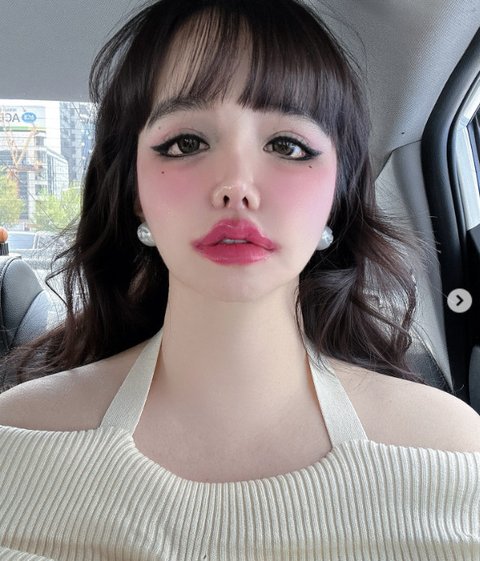 사진 속 박봄은 베이지색 홀터넥 니트를 입고 있다. 짙게 그린 아이라인과 짙은 색의 오버립 메이크업이 눈길을 끈다.