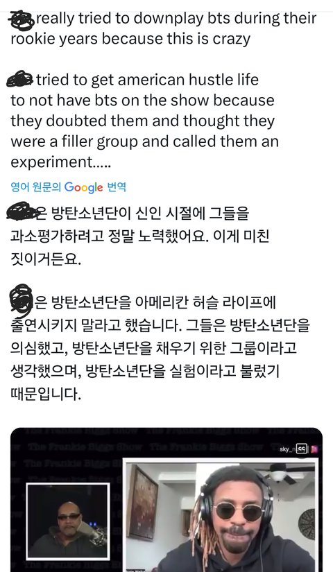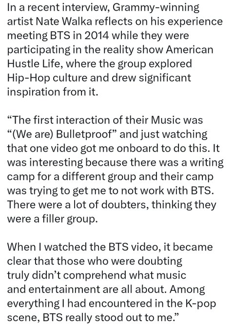 인터뷰한 사람은 아허라에 같이 나왔던 Nate Walka 라는 사람이고 원본 영상 보면 언급한 다른 회사 이름, 그룹 이름 다 얘기함------------------------이건 관련 트위터 글 번역---최근 인터뷰에서 그래미상을 수상한 아티스트 네이트 워카는 2014년 리얼리티 쇼 '아메리칸 허슬 라이프'에 참여하면서 방탄소년단을 만난 경험을 회상하며 힙합 문화를 탐구하고 그로부터 상당한 영감을 얻었습니다. 그들의 음악이 처음으로 상호작용한 것은 (우리는) 방탄소년단입니다. 라는 영상 하나를 보는 것만으로도 이 일을 해낼 수 있었습니다. 다른 그룹을 위한 글쓰기 캠프가 있었고 그들의 캠프가 방탄소년단과 함께 일하지 않도록 하려고 했기 때문에 흥미로웠습니다. 필러 그룹이라고 생각하며 의구심을 품는 사람들이 많았습니다. 방탄소년단 영상을 보니 정말 의심하는 사람들이 음악과 엔터테인먼트가 무엇인지 이해하지 못한다는 것이 분명해졌습니다. 제가 케이팝 씬에서 접한 모든 것 중에서 방탄소년단은 정말 눈에 띄었습니다.