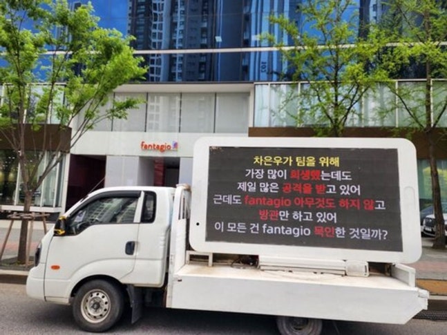 21일 서울 강남구에 있는 판타지오 사옥 앞에서 차은우의 일부 팬덤이 트럭시위를 벌였다. 트럭 전광판에는 "차은우가 팀을 위해 가장 많이 희생하고 제일 많은 공격을 받았는데 판타지오는 방관만 하고 있다", "차은우가 근거 없는 비방에 휘말리는 것과 관련해 소속사에서 적극적으로 대처하라", "아티스트 보호와 개인활동 및 장기전 발전을 위해 신경 써달라" "돈 벌 생각만 하지 말고 차은우를 잘 보호해야지 팬들이 계속 지켜볼 거야 잘해라" 등의 문구가 담겨있다.