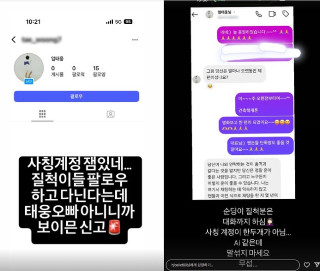 그는 “사칭 계정 재밌네. 질척이들(팬) 팔로우하고 다닌다는데 태웅 오빠 아니니까 보이면 신고”라며 해당 계정이 엄태웅의 팬들에게 접근하고 있음을 알렸다.