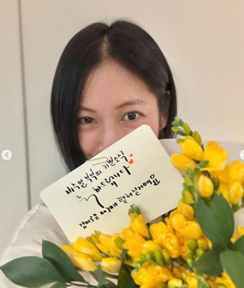 공개된 사진 속 반소영은 노란색 꽃다발을 든 채 환하게 웃고 있다. 꽃다발 가운데에는 '비주얼 부부의 기쁜 소식 축하드립니다. 경이로운 세계가 펼쳐질 거예요'라는 문구가 적혀 있다.