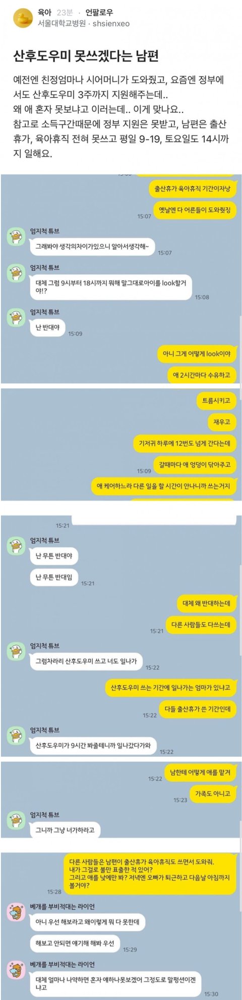 미친x인가...?모르면 찾아보든 물어보든...갓출산한 산모가 어케 24시간 혼자 애를봐...?진짜 딱밤마렵다....