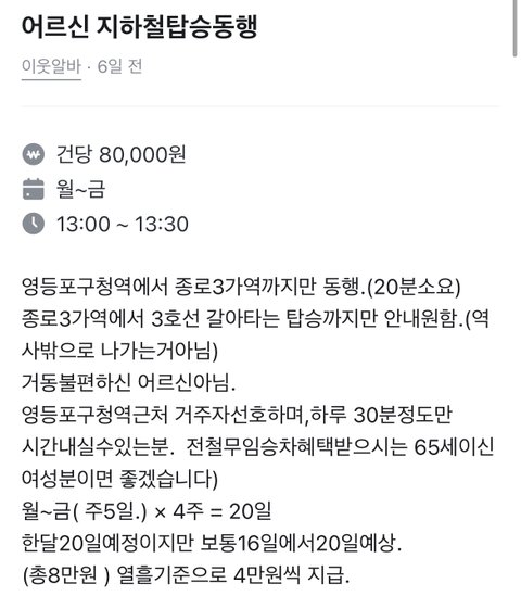 하루에 편도 30분 4천원이면 시급 8천원 ㅋㅋㅋㅋㅋㅋ
