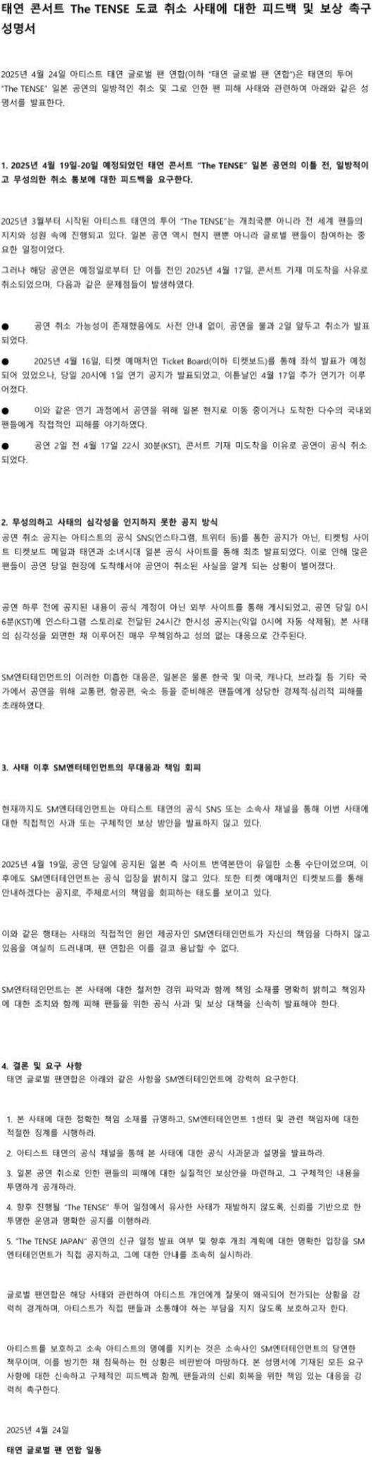 성명서에서 태연의 글로벌 팬 연합은 성명서에서 태연의 투어 ‘The TENSE’ 일본 공연의 일방적인 취소 및 그로 인한 팬 피해 사태와 관련해 태연의 소속사인 SM엔터테인먼트를 향해 비판의 목소리를 높이며 피드백을 요구했다.