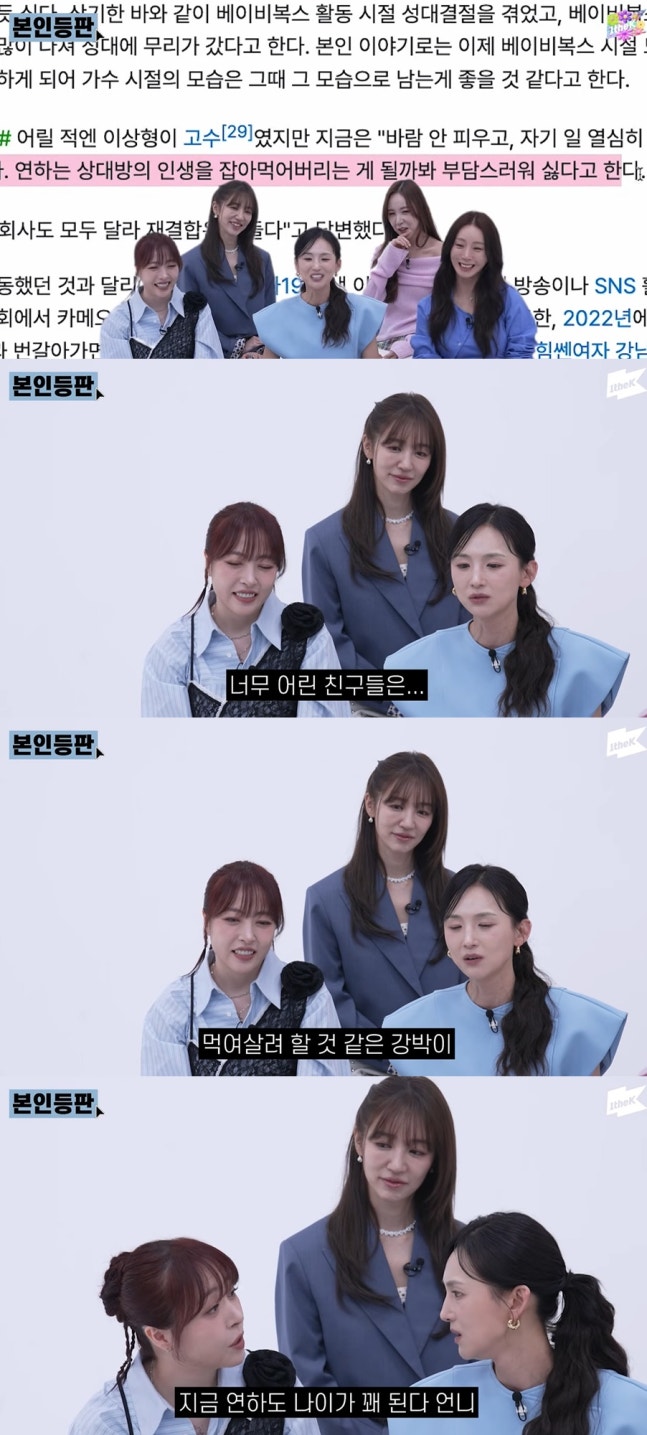 해당 영상에는 베이비복스 완전체가 출연해 온라인상에 정리된 자신들의 정보를 직접 확인하며 이야기를 나눴다. 이희진은 과거 2019년 SBS '런닝맨'에 출연해 "연하는 상대방의 인생을 잡아먹어 버리는 게 될까봐 부담스러워 싫다"고 밝힌 바 있다.