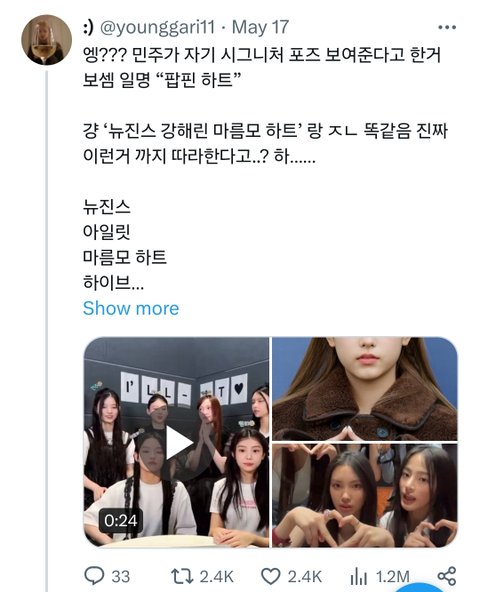 이거 기억남?ㅋㅋㅋㅋㅋ 걍 뉴진스는 팬들도 개또라이 정신병 싸불러인거 이거 보고 알았었는데ㅋㅋㅋㅋ 손가락 하트에 소유권 주장ㅋㅋ 심지어 느그 해린이 원조도 아님