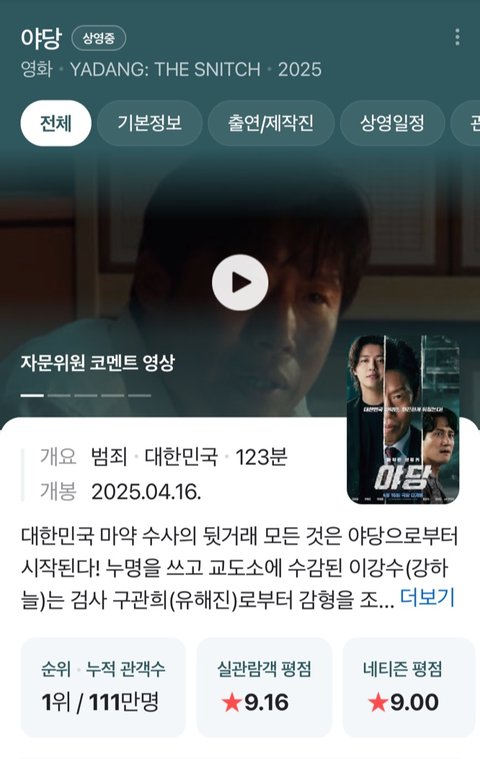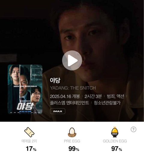 개봉과 동시에 8일 연속 전체 박스오피스 1위를 굳건히 지키고 있는 '야당'은 전체 예매율 1위를 차지하며 '마인크래프트 무비', '거룩한 밤: 데몬 헌터스', '파과' 등 신작들의 공세 속에서도 흔들림 없는 흥행 추이를 보이고 있다. 뿐만 아니라 개봉 2주 차 화요일에 동원한 일일 관객 수가 9만1360명으로 개봉일 오프닝 스코어(8만5705명)를 뛰어넘으며 개싸라기 흥행세를 이어가고 있다.