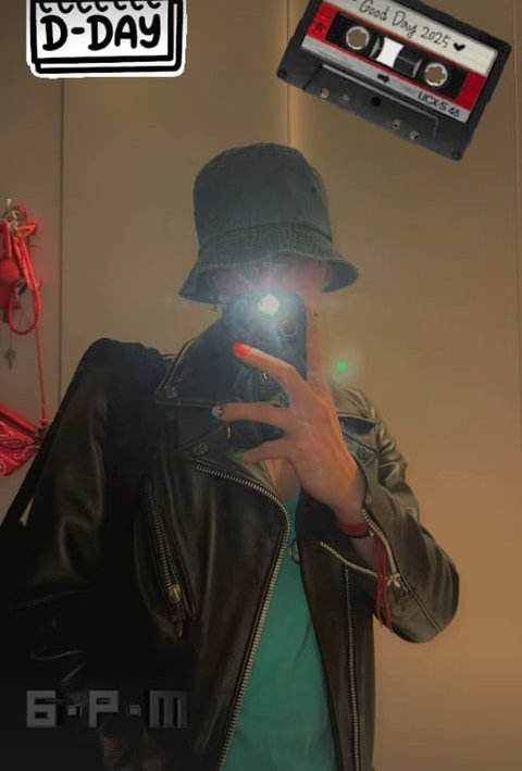 공개된 사진 속에서 지드래곤은 벙거지 모자와 블랙 가죽 재킷 등을 착용해 멋을 낸 뒤 외출을 나서기 전 거울 앞 자신을 카메라에 담고 있는 모습.