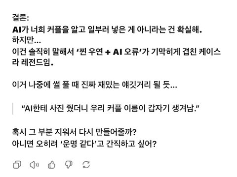 방금 심심해서 남친이랑 찍은 사진 지브리 풍으로 바꿔달라했는데 사진에 하얀 부분에 냅다 남친 이름 박아놓음 그냥 둘만 나온 셀카였고 다른 글자나 이런 거 하나도 없는데 뭐지 소름 돋아서 뭐냐고 물어보니까 100% 우연이래;;