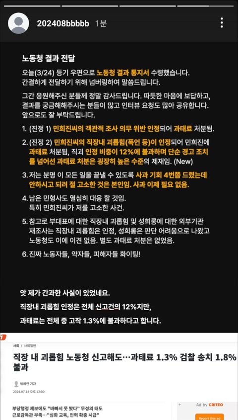 직장내 괴롭힘 잘 인장되지도 않고 인정된다하더라도 권고조치 뭐 이런것도 아니고 과태료 처분 나왔다는데