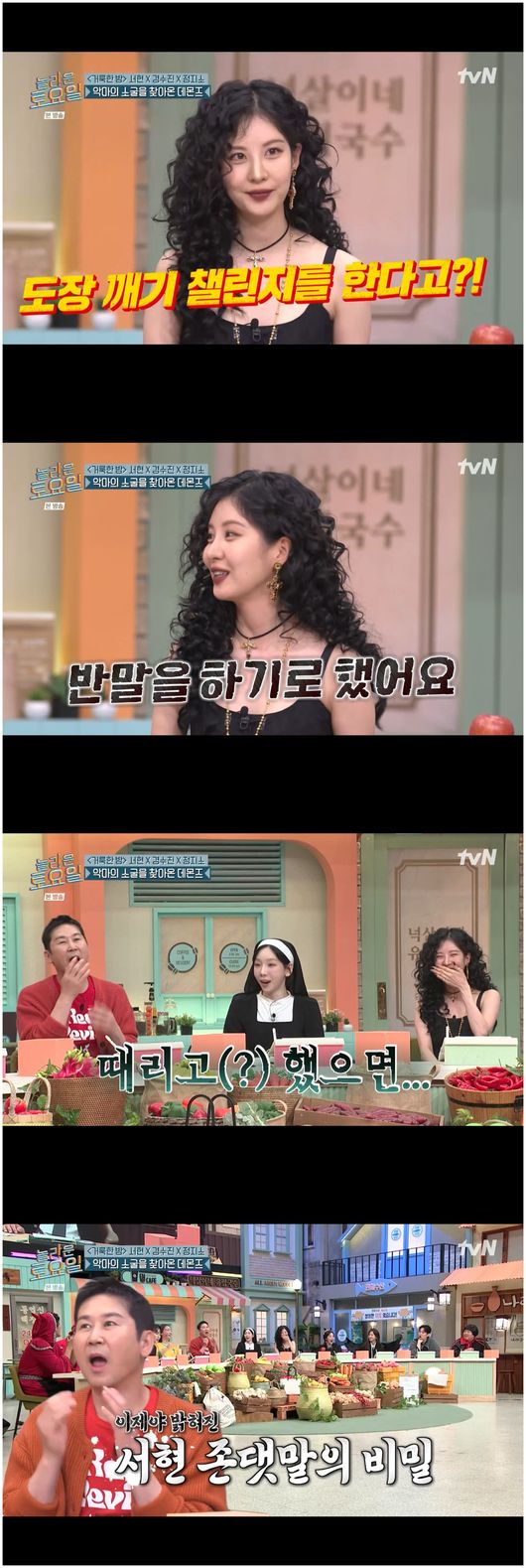 26일 방영된 tvN 예능 ‘놀라운 토요일’(이하 '놀토')에서는 영화 ‘거룩한 밤 - 데몬 헌터스’에서 악마를 사냥하는 샤론 역할의 배우 서현이 등장했다.