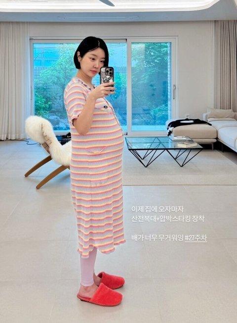 레이디 제인은 27일 자신의 계정에 "이제 집에 오자마자 산전복대+압박스타킹 장착. 배가 너무 무거워. #27주 차"라는 글과 함께 한 장의 사진을 게재했다.