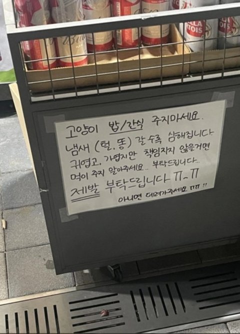 웃긴건 경고문을 붙여놓았는데 길고양이 학대행위에 대해 고소고발 조치하고 절대 그냥 넘어가지 않겠다는 무시무시한 경고문을 붙여놨는데 이러면 지네가 하고있는 민폐행위에 대해서도 고소고발조치를 겸허히 받아들일 자세가 되있다는 거겠죠?