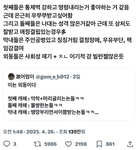 근데 둘째 셋째 외동 설명은 잘 모르겟듬 일단 내 동생은 안 저러고 주위에 외동인 친구들도 안 저럼