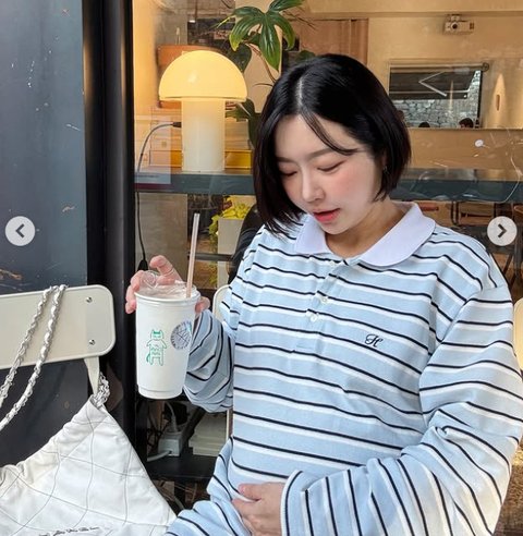 사진 속 레이디 제인은 카페에서 단 음료를 마시고 있다. 레이디 제인은 태동이 느껴지는 등 배를 어루만지고 있다.