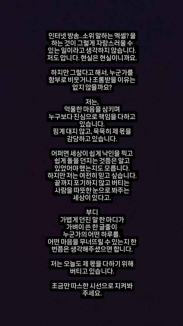 그러면서 "저는 오늘도 제 몫을 다하기 위해 버티고 있다. 조금만 따듯한 시선으로 지켜봐 달라"고 덧붙였다.