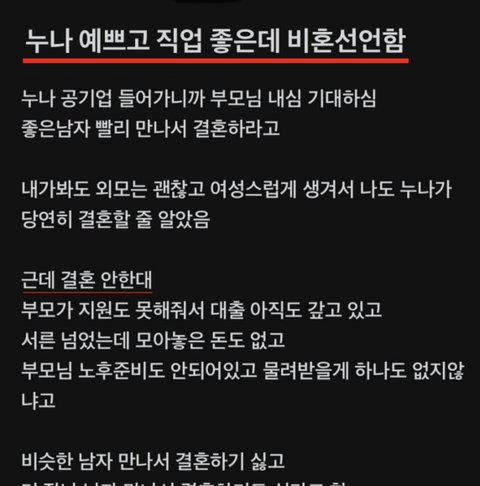 캡쳐에 중요한 게 빠졌는데 저 누나분은 "비슷한 남자 만나서 결혼하기 싫고 더 잘난 남자 만나서 결혼하기도 싫다"라고 했습니다 동질혼 뿐 아니라 상향혼도 싫다는 거예요 현실이 개선되지 않는 이상은 동질혼해서 허덕이기도 싫고 상향혼해서 갑질 당하기도 싫다... 결혼하기엔 너무 똑똑한 사람이에요