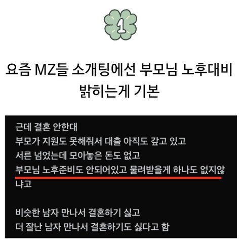 슬프지만 요새 이런 경우 진짜 많음. 여자쪽이고 남자쪽이고 상관없이 골골거리면서 100세 사는 시대라서 노후준비 안 된 양가부모님이 결혼조건 중 제일 걸리는 문제가 된거임.