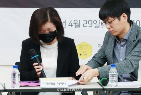 29일 서울 중구 프레스센터 언론노조 회의실에서 진행된 143엔터테인먼트 이용학 대표의 강제추행 사건 고소 기자회견에서 피해자 어머니(왼쪽)가 입장을 밝히고 있다. /2025.04.29이동훈 기자 (photoguy@mt.co.kr)Copyright ⓒ 스타뉴스. All rights reserved. 무단 전재 및 재배포 금지.