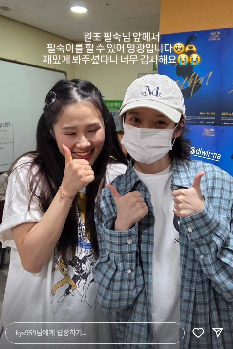 사진 속 아이유는 김예솔과 함께 편안한 차림으로 엄지 포즈를 취하고 있다. 박경림 등과 단체 사진 촬영에 임하기도 했다.