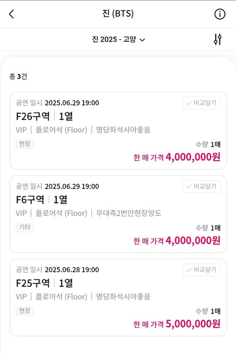 그룹 방탄소년단(BTS) 진의 첫 단독 팬 콘서트를 앞두고 암표가 기승을 부리고 있다. 중고거래 사이트에는 정가보다 최대 200배 비싼 암표 판매 글이 올라와 있다.진은 오는 6월 28~29일 고양 일산서구 고양종합운동장 보조경기장에서 첫 단독 팬콘서트 ‘#RUNSEOKJIN_EP.TOUR’를 개최한다. 티켓 가격이 VIP석 19만 8천원, 일반석 15만 4천원으로 책정된 가운데, 지난 28일 BTS 멤버십 가입자들을 위한 선예매가 진행됐다.