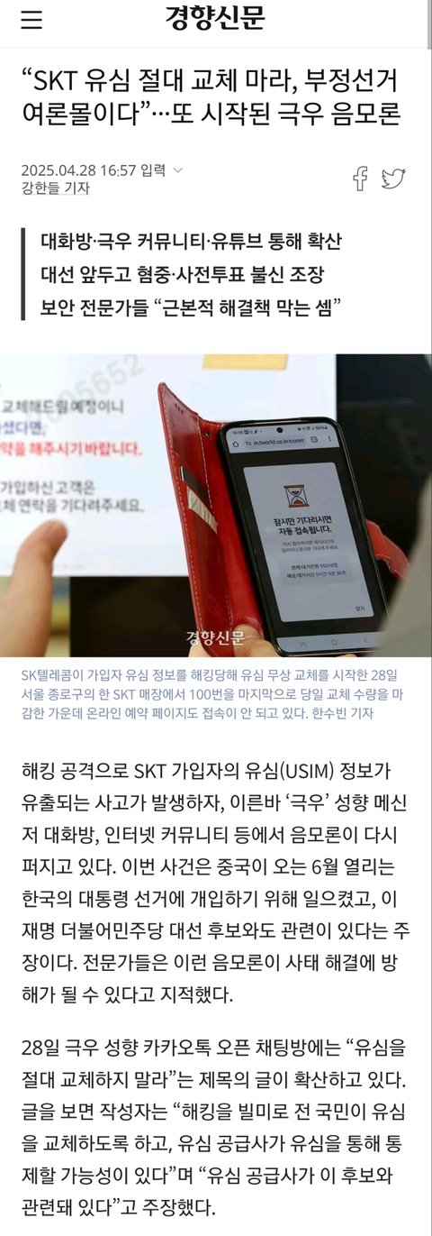 “SKT 유심 절대 교체 마라, 부정선거 여론몰이다”···또 시작된 음모론