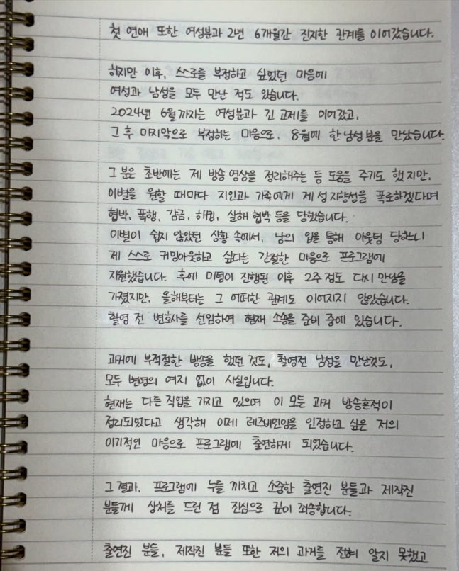 먼저 함께 출연하신 출연진 분들, 제작진 분들, 저를 아껴주신 주변 분들, 그리고 지켜봐 주신 모든 시청자분들께 심려와 불편을 끼쳐드린 점 진심으로 깊이 사과드립니다.