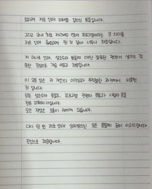 그리고 국내 최초 레즈비언 연애 프로그램이라는 큰 의미를 저로 인해 훼손하게 된 것 같아 너무나 죄송합니다.