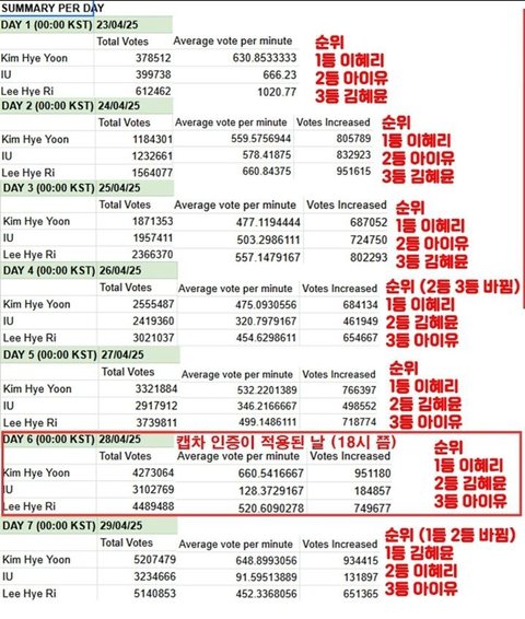 1~3등 저렇게 유지하다가 갑자기 18시 쯤에 캡차가 적용됐거든... 김혜윤 + 아이유 투표수에게 효과가 없는데