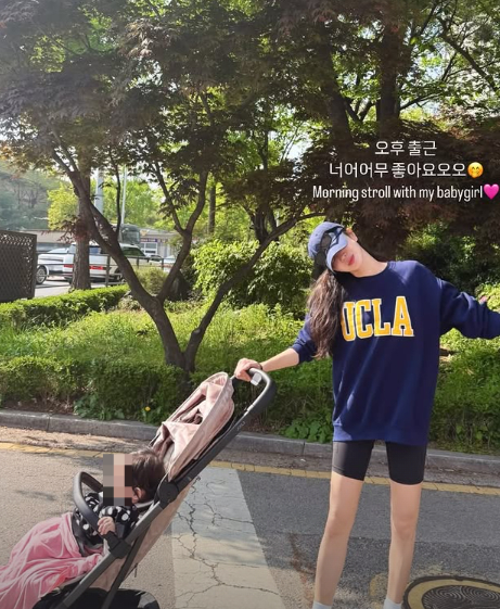 사진 속 김윤지는 딸을 유모차에 태운 채 산책하고 있다. 김윤지는 딸과 산책하며 행복해 보이는 모습이다.