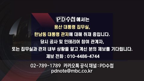 PD수첩에서는 용산 대통령 집무실, 한남동 대통령 관저에 대해 취재 중입니다. 당시 공사 및 인테리어 참여 관계자, 또는 집무실과 관저 내부 상황을 알고 계신 분의 제보를 기다립니다.