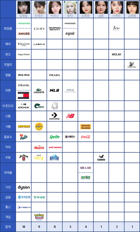 아이브, 에스파, 엔믹스, 르세라핌, 장원영, 안유진, 카리나, 윈터, 설윤, 사쿠라, 김채원, 뉴진스, 하니, 민지, 해린