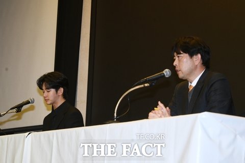 법무법인 엘케이비앤파트너스 17일 오후 "소송비용은 4월 10일자로 반했다"고 털어놨다. 사진은 김수현이 엘케이비앤파트너스 변호사와 31일 기자회견에서 입장을 밝히고 있다. /서예원 기자