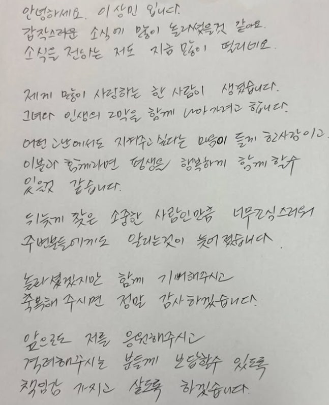 이상민은 4월 30일 소셜미디어를 통해 손편지를 업로드하며 재혼 사실을 직접 밝혔다.