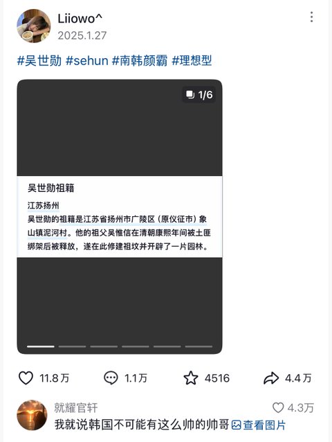 왜 이럴까 알아봤는데 세훈 성씨가 황해남도 해주를 본관으로 두고있는 해주오씨임. 시조는 고려때 송나라에서 온 중국인이라는데 아무리 조상이 중국인이라고 해도 이미 한반도에서 정착한지 1000년이 넘은 한국 토착 집안인데 중국이랑 연관짓는게 어이가없네;; 그리고 한국 족보 개판인거 다들 알지?? ㅋㅋ얘네들은 무쌍에 눈 작은 연예인은 한국계라고 하고 유쌍에 이목구비 뚜렷한 애들한테은 조상 중에 중국인이 있을거라고 ㅇㅈㄹ하는 애들임.. 애들 머리채좀 그만 잡아 쭝궈들아;; 멀쩡한 한국인이 중국인 되고 싶어 할까???