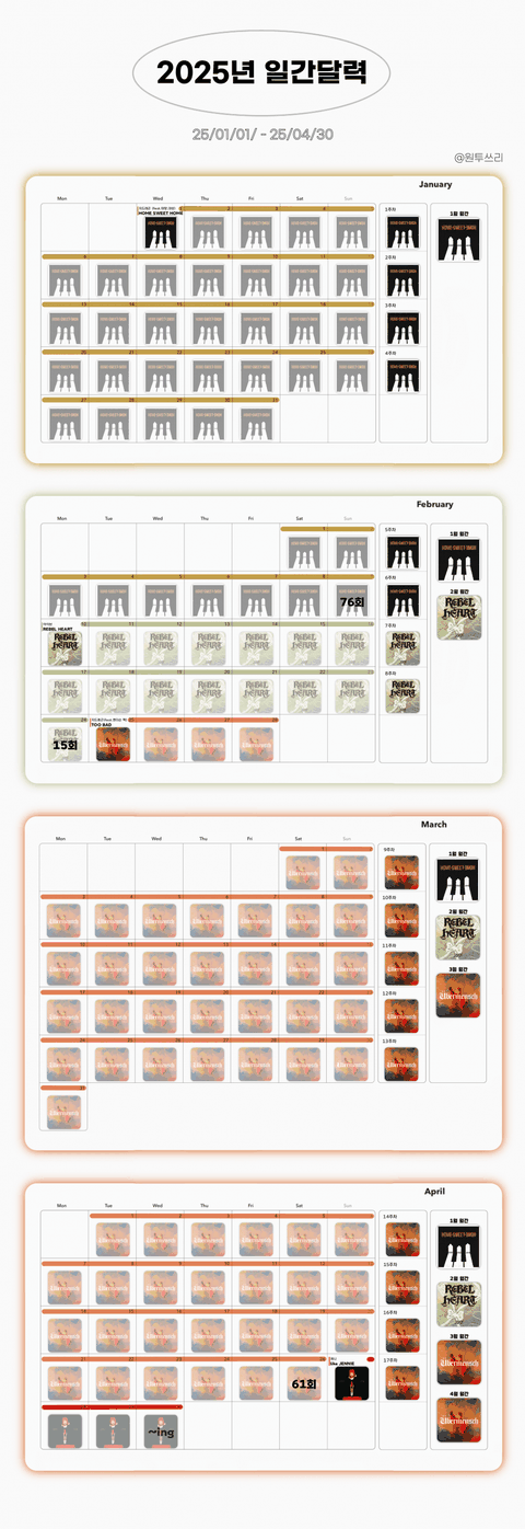 홈스윗홈 (76회)-> 레벨하트(15회) -> 투배드(61회) -> 라이크제니(3회 ing)