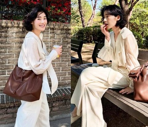 고운 주름이 잡힌 아이보리 셋업에 브라운 톤의 빅 숄더백을 매치하며 부드럽고 여유로운 무드를 고스란히 담아냈다.사진=정은채 SNS고운 주름이 잡힌 아이보리 셋업에 브라운 톤의 빅 숄더백을 매치하며 부드럽고 여유로운 무드를 고스란히 담아냈고, 셔링 디테일이 돋보이는 블라우스와 넉넉한 실루엣의 와이드 팬츠는 군더더기 없는 스타일링으로 정은채만의 미니멀 감성을 완성했다.여기에 산뜻한 캔버스 스니커즈를 더해 편안한 일상미를 살렸고, 커피 한 잔을 들고 꽃길과 숲길을 거니는 그의 모습은 마치 한 편의 영화 속 한 장면처럼 따뜻한 여운을 남겼다. 짧은 웨이브 단발과 햇살 아래 지은 미소는 봄 그 자체였고, ‘걷는 것만으로도 그림이 되는 여자’라는 수식어가 절로 떠오르는 순간이었다.
