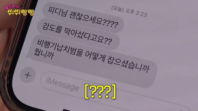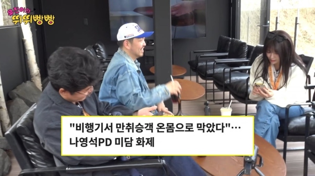 사진=유튜브 '채널 십오야'한편, 나영석PD는 절친한 배우 최우식으로부터 "강도 때려잡았냐"는 메시지를 실시간으로 받았다. 촬영날 '비행기 만취승객 온몸으로 막았다'는 기사가 도배된 것. 그는 "비행기에 탔는데 뒤에서 싸움이 났다. 이륙 전에 안정이 됐는데 착륙 직전이 되니까 '너 이제 내리니까 따라 와'라고 하더라"고 설명했다.