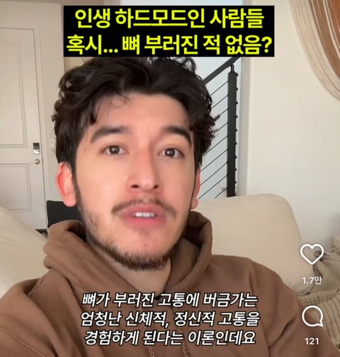나 뼈 부러져본적도 없고 금간적도 없음 그 흔한 인대 늘어난적도 없음 근데 나 ㄹㅇ 인생 막장드라마 급임 내 인생이 왜 이렇게 ㅈ같나 했는데 이거때문이였음